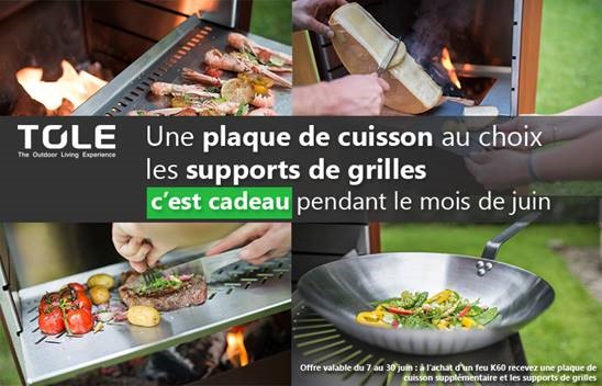 A l'achat d’un feu K60, TOLE offre une plaque de cuisson supplémentaire au choix et les supports de grille pour la ranger en fin de préparation.